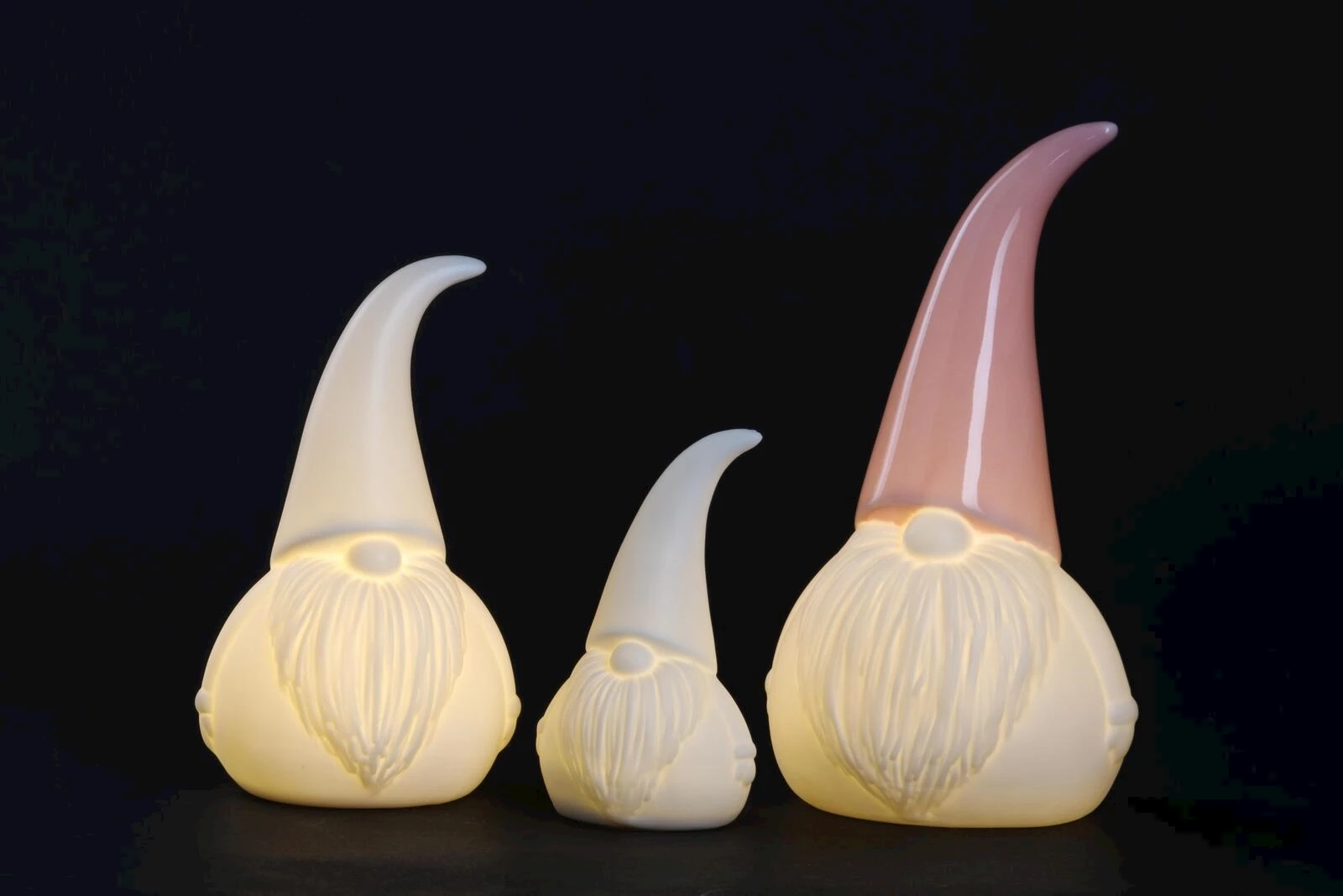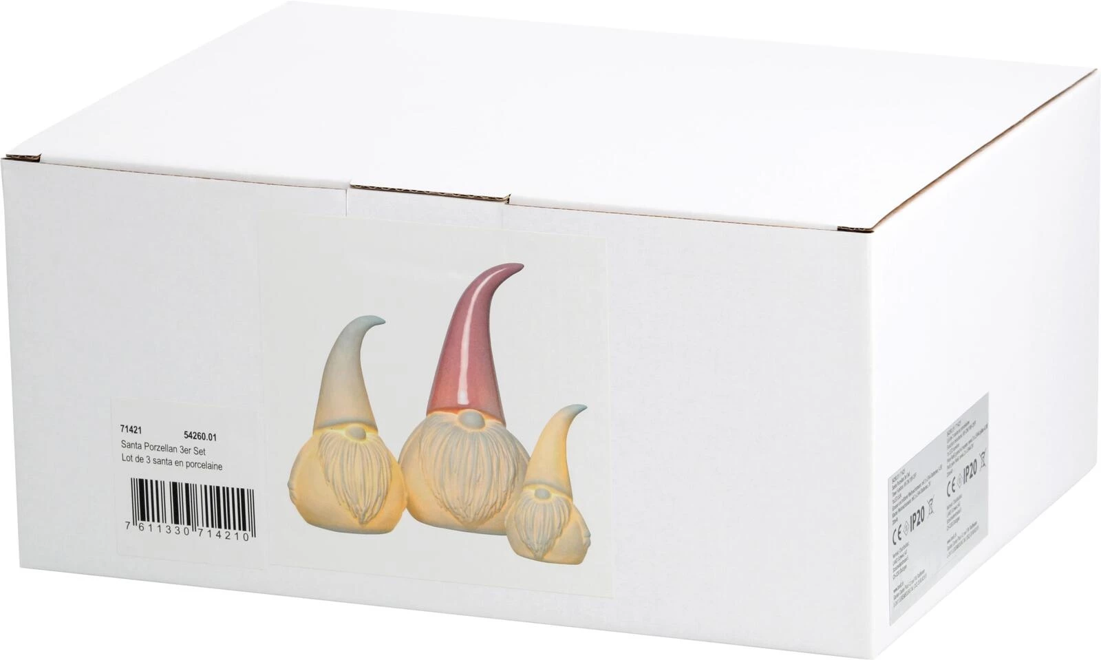 Das 3er Set Santa aus Porzellan hat ein LED-Licht integriert welches mit einem Timer vom 6 h ein und 18 h aus eingestellt werden kann. Für die beiden grösseren Figuren werden jeweils 3 × LR44 Batterien und für die kleine 2 × LR44 Batterien benötigt.