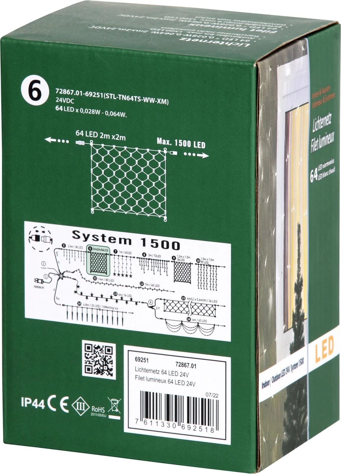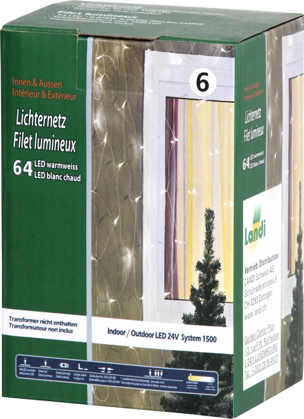 Das Lichternetz mit 64 warmweissen LEDs sorgt für eine gleichmässige Festgasbeleuchtung im Innen- und Aussenbereich. Mit einer Grösse von 2 × 2 Metern eignet es sich ideal zur Dekoration von Wänden, Bäumen oder Balkonen. Dank der Schutzklasse IP44 ist das Netz spritzwassergeschützt und damit perfekt für den Einsatz im Freien geeignet. Die transparente Verkabelung fügt sich dezent in jedes Dekor ein. Im Lieferumfang sind Stecker und Buchse für eine einfache Installation enthalten. Der Transformator ist nicht im Set enthalten und muss separat erworben werden.