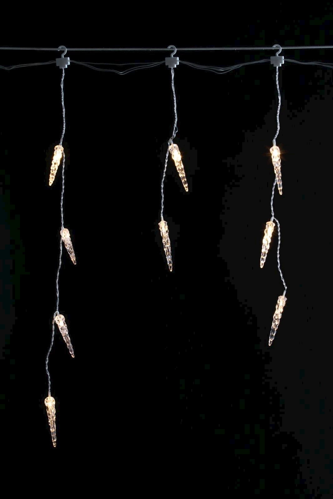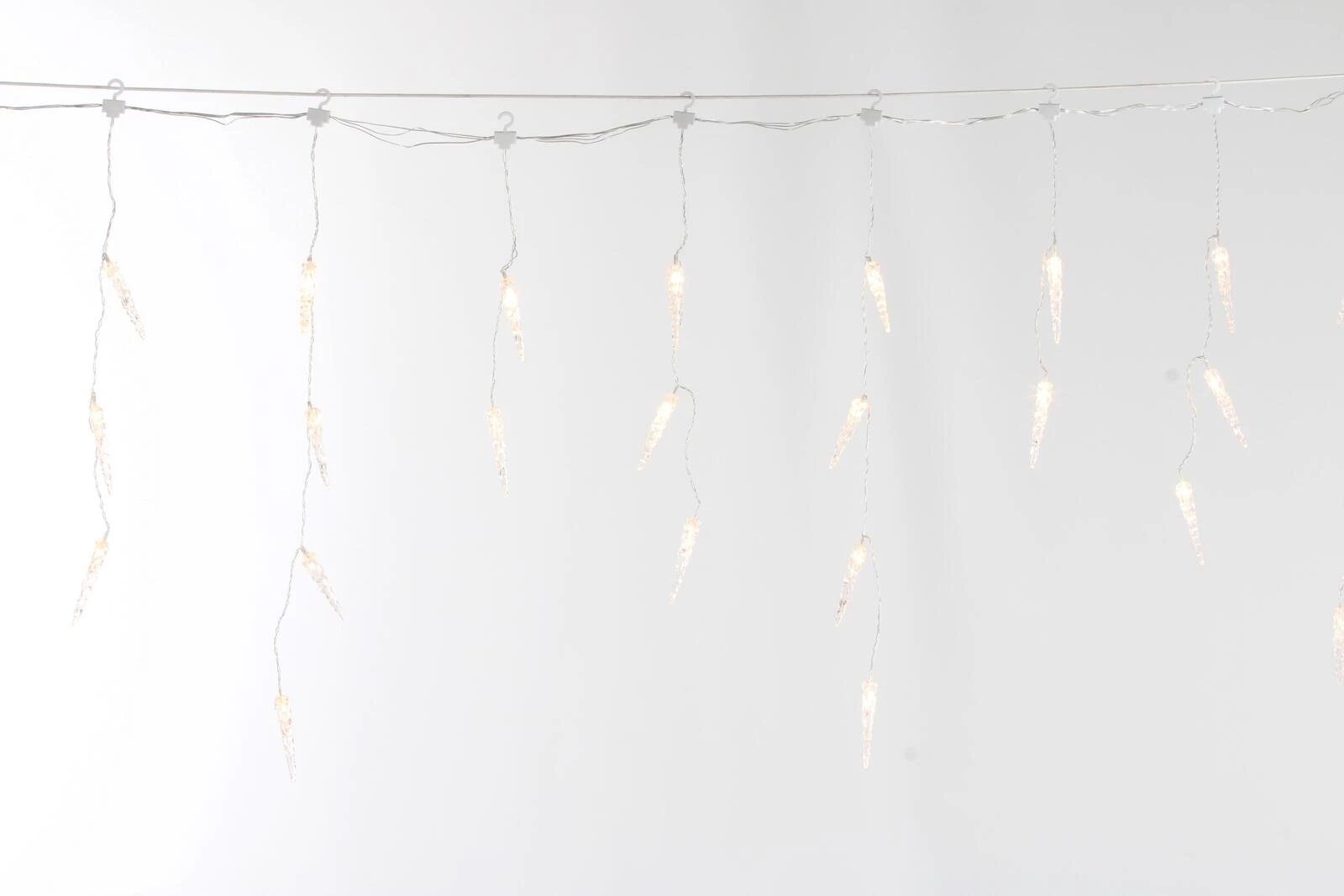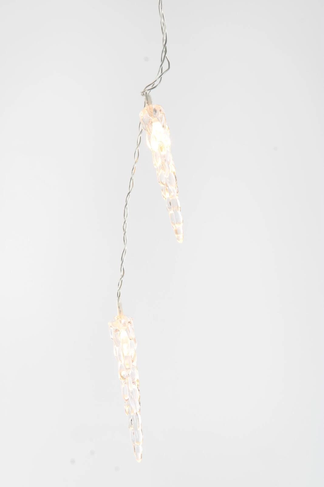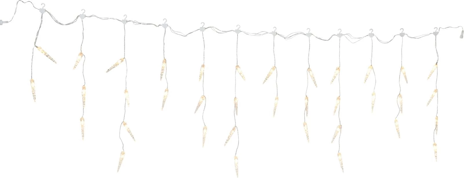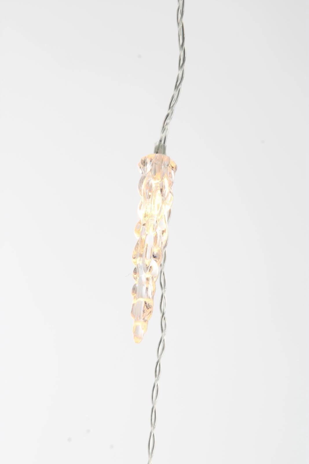 Mit 36 warmweissen LEDs in Eiszapfen-Optik und transparentem Kabel für den Innen- und Aussenbereich. Leistung: 3,6 W. Länge: 2,4 m. Inkl. Stecker und Buchse. Exkl. E-Transformer.