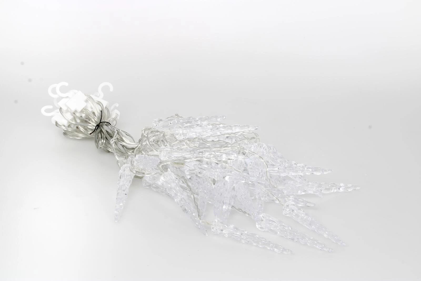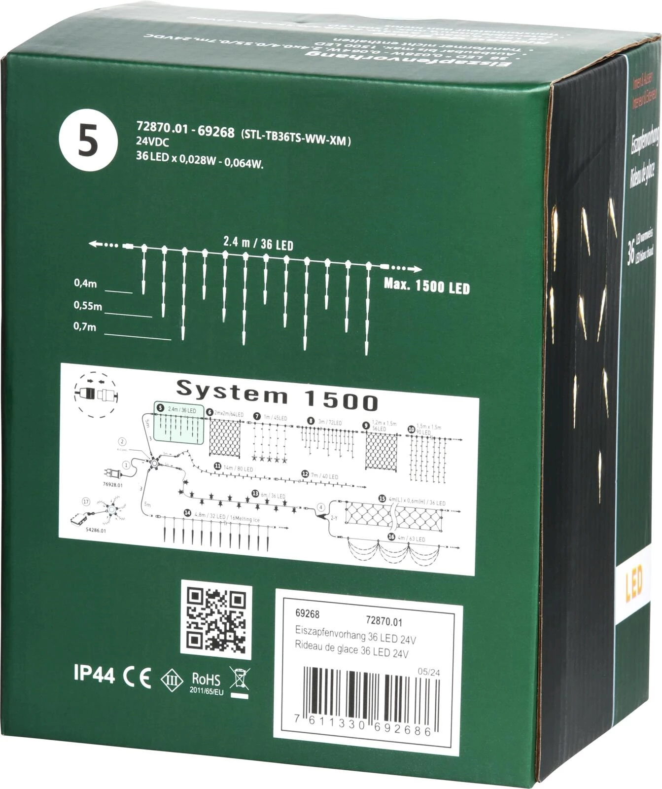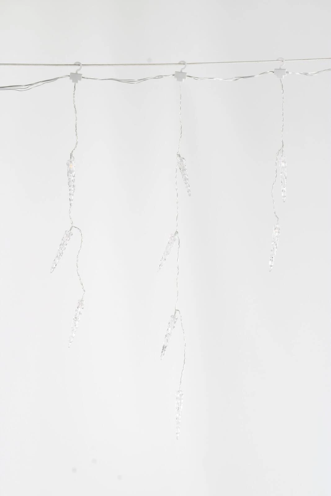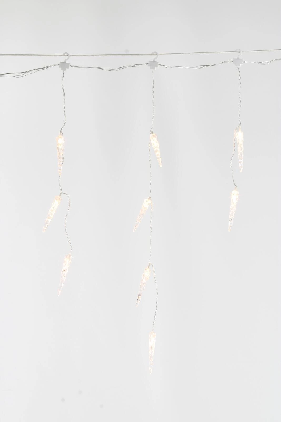 Mit 36 warmweissen LEDs in Eiszapfen-Optik und transparentem Kabel für den Innen- und Aussenbereich. Leistung: 3,6 W. Länge: 2,4 m. Inkl. Stecker und Buchse. Exkl. E-Transformer.