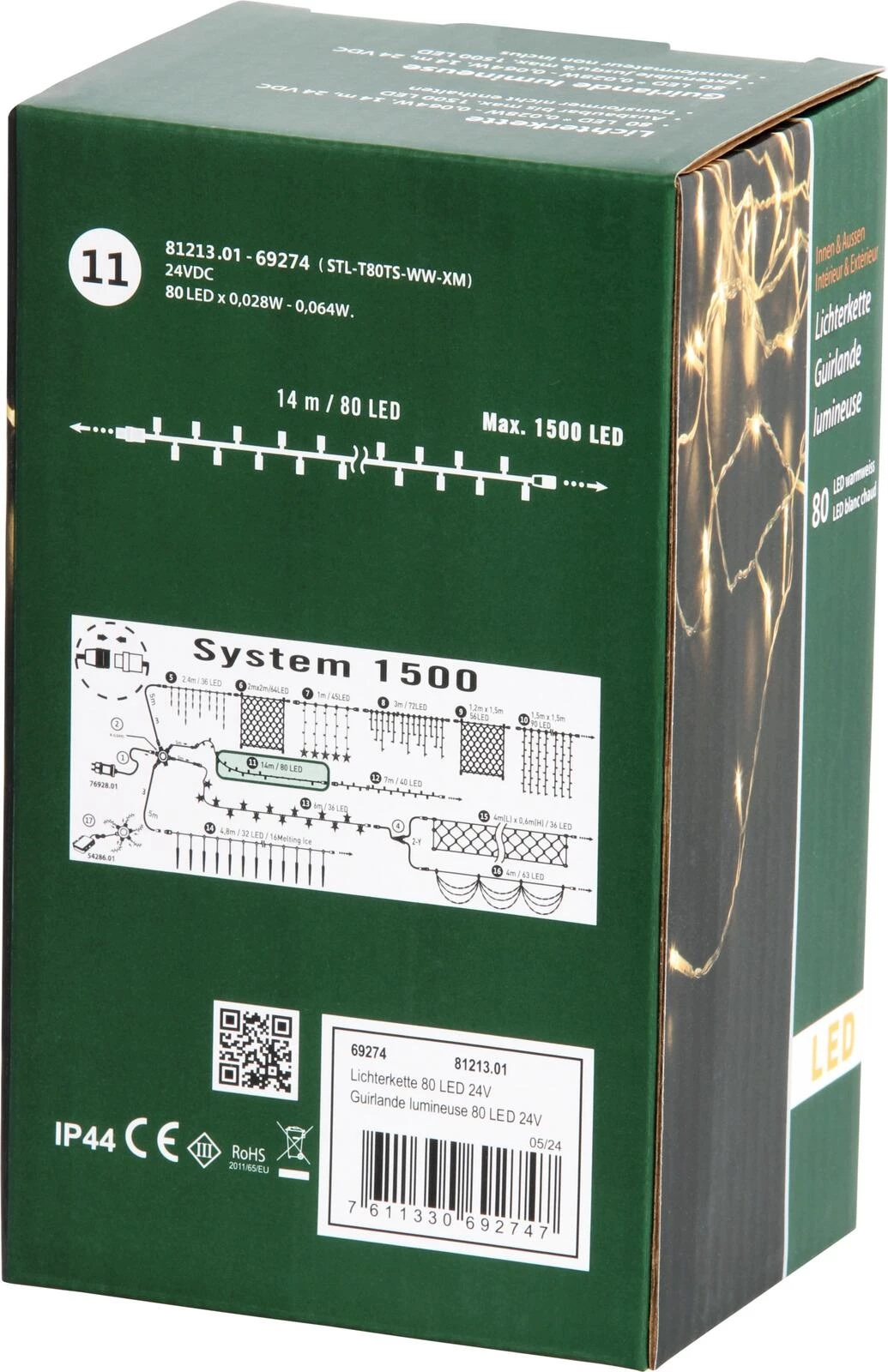Diese Lichterkette mit 80 warmweissen Lampen erzeugt eine stimmungsvolle Atmosphäre im Haus- und Aussenbereich. Mit einer Länge von 14 Metern ermöglicht sie vielfältige Gestaltung, um Räume, Terrassen oder Gärten elegant zu verzieren. Das klare Kabel integriert sich harmonisch in jede Umgebung. Aufgrund der Schutzklasse IP44 bleibt die Lichterkette wasserabweisend und ist perfekt für den Aussenbereich geeignet. Sie funktioniert mit einer Eingangsspannung von 24 V und besitzt einen Anschluss sowie eine Buchse. Bitte berücksichtige, dass der E-Transformer nicht mitgeliefert wird.
