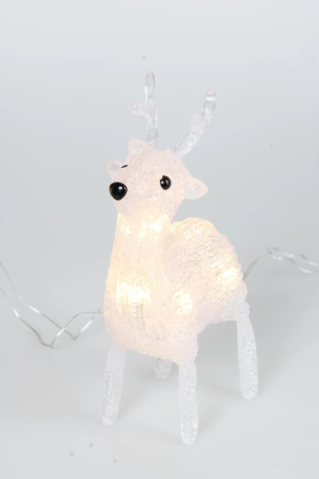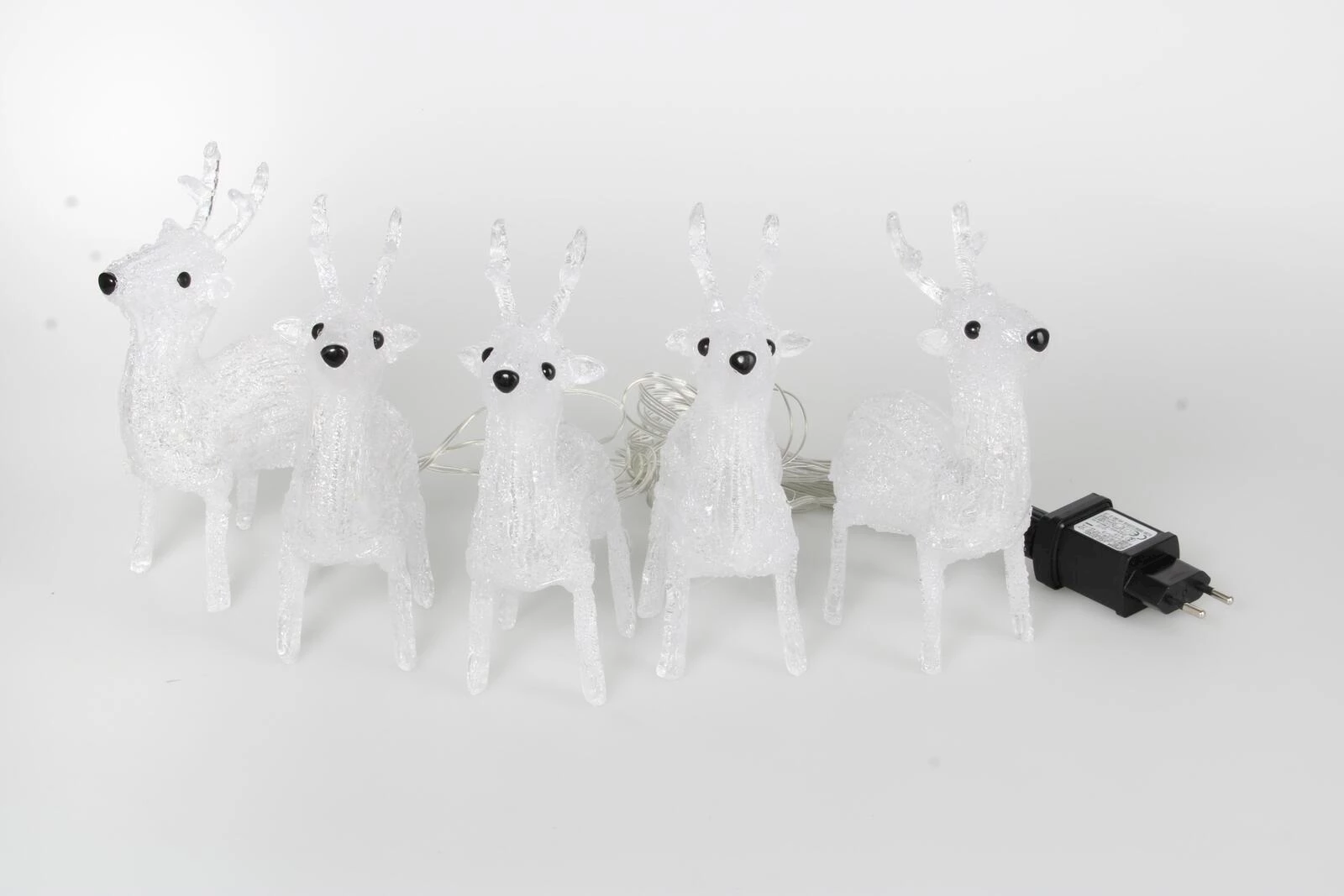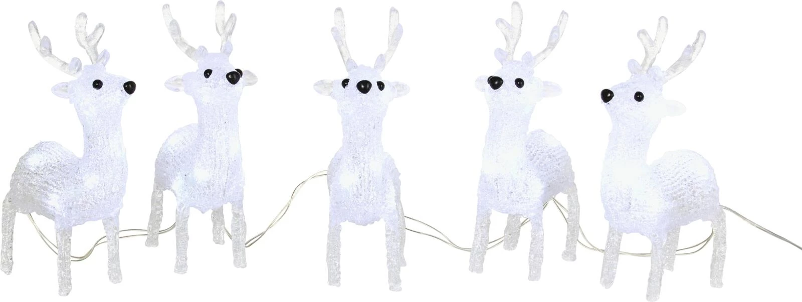 Für den Innenbereich. 40 warmweisse LEDs. Mit Timer. Leistung: 1,2 W. Länge: 5 m. Masse Rentiere: 19 × 6 cm. Inkl. Transformer.
