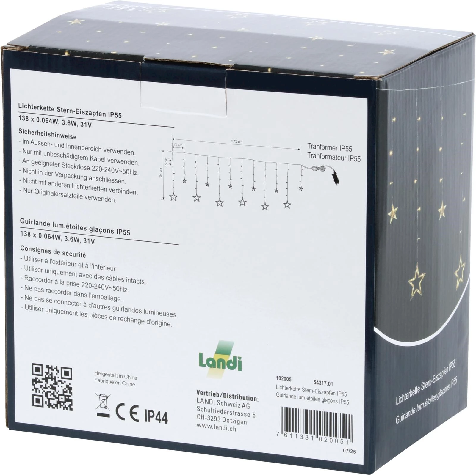 Die Lichterkette Stern-Eiszapfen bringt nicht nur festlichen Glanz in Ihr Zuhause, sondern überzeugt auch durch ihre hochwertige Verarbeitung und vielseitige Einsetzbarkeit. Mit insgesamt 138 warmweissen Mikro-LEDs erzeugt sie eine stimmungsvolle Beleuchtung im Innen- wie auch im Aussenbereich. Dank der Schutzklasse IP55 ist sie bestens gegen Staub und Spritzwasser geschützt und damit auch bei winterlichen Wetterbedingungen zuverlässig einsetzbar.
