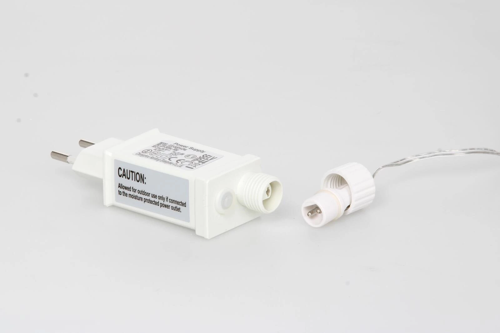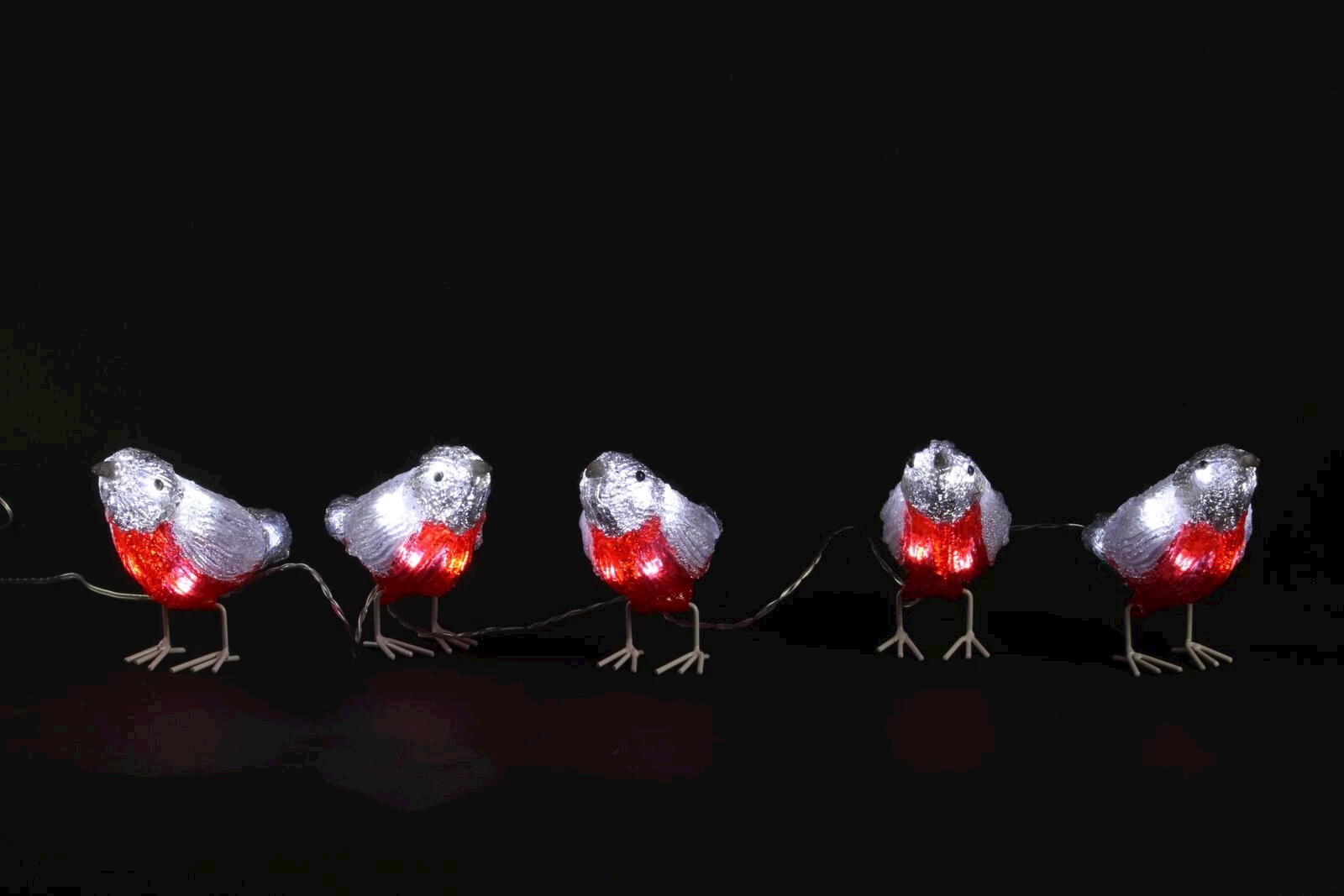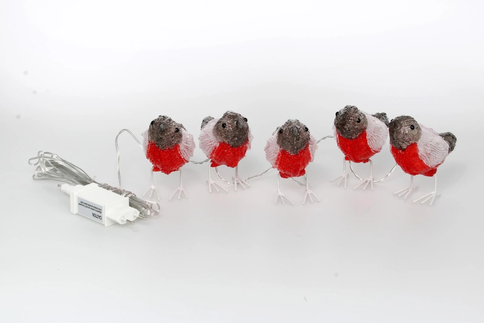 5 Acrylvögel mit 40 weissen LEDs. Mit Timer. Für Innen und Aussen. Leistung: 1,4 W. Anschlusskabel: 5 m. Masse Vogel: 15 × 13 × 6 cm. Inkl. Transformer.