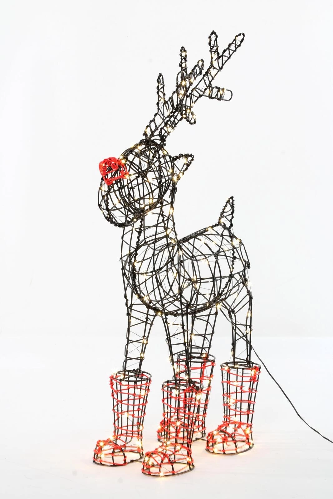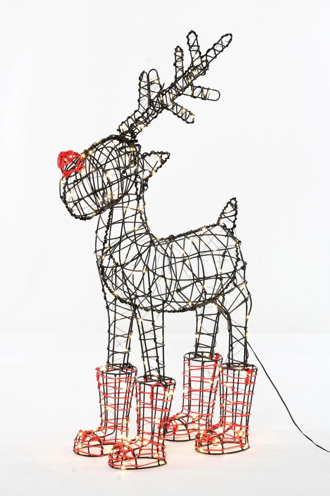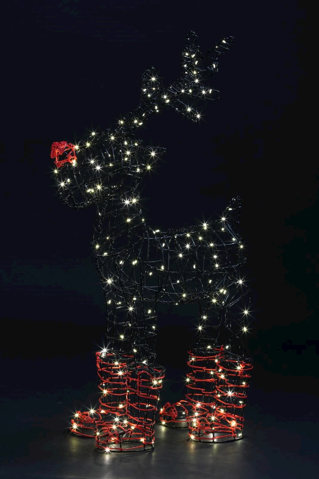 Das Rentier mit 200 warmweissen LEDs sorgt im Innenbereich für eine festliche und gemütliche Atmosphäre. Mit seinen Massen von 80 × 47 × 20 cm ist es ein dekorativer Blickfang für Wohnräume oder Eingangsbereiche. Die integrierte Timerfunktion ermöglicht eine automatische Beleuchtung für 6 Stunden, gefolgt von 18 Stunden Pause, was einen energiesparenden Betrieb sicherstellt. Das Rentier hat eine Leistung von 2,7 W und wird inklusive Transformator IP55 und Batteriebox geliefert. Für den Batteriebetrieb sind 4 × AA-Batterien erforderlich, die nicht im Lieferumfang enthalten sind.