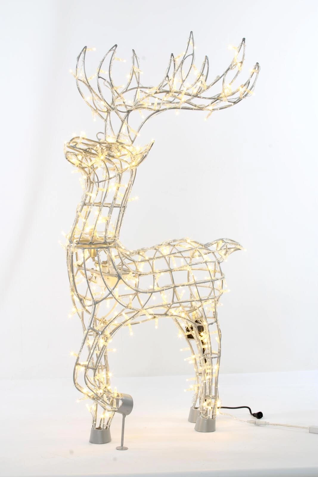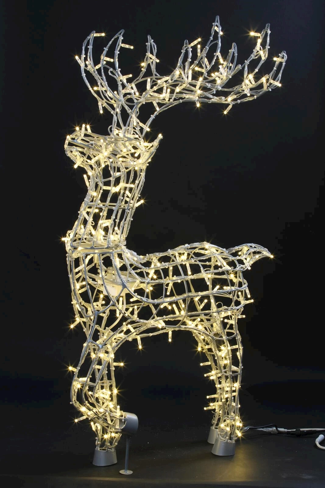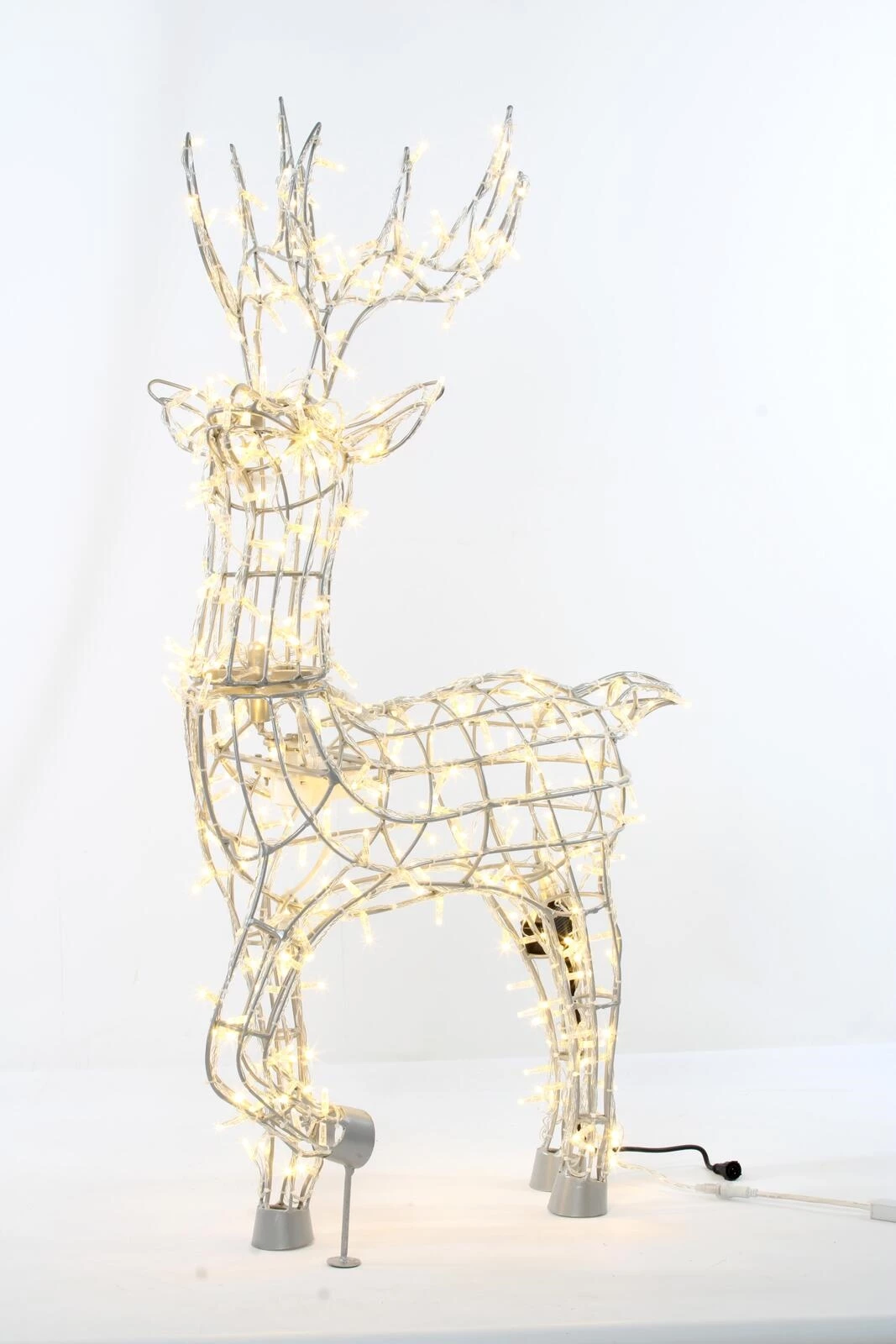 Das Rentier Willy mit 300 warmweissen LEDs sorgt im Innen- und Aussenbereich für eine festliche und einladende Atmosphäre. Mit einer Grösse von 120 × 80 × 25 cm ist es ein beeindruckender Blickfang, der sowohl in Gärten als auch auf Terrassen oder in Wohnräumen für weihnachtliche Stimmung sorgt. Der drehbare Kopf verleiht der Figur eine lebendige Ausstrahlung. Dank der Schutzklasse IP55 ist das Rentier staub- und strahlwassergeschützt und somit optimal für den Einsatz im Freien geeignet. Die Leistung beträgt 15 W, und im Lieferumfang sind ein passender Transformer sowie ein 5 m langes Netzkabel enthalten, wodurch Ihnen eine flexible Platzierung ermöglicht wird.