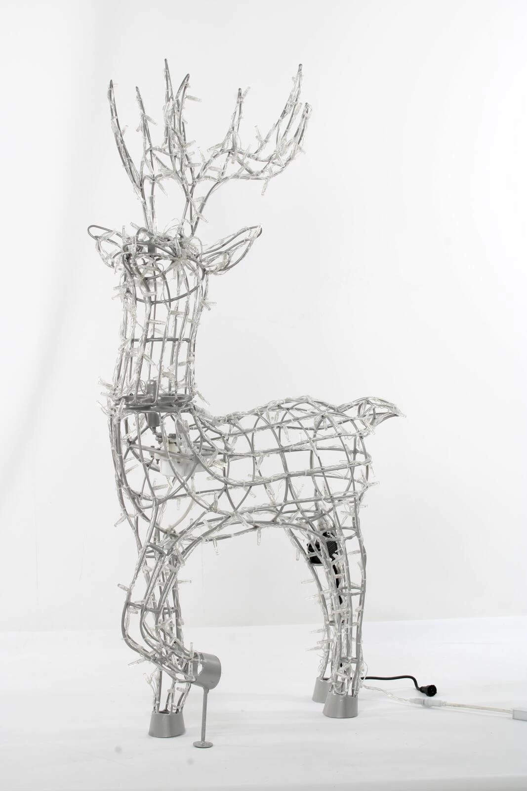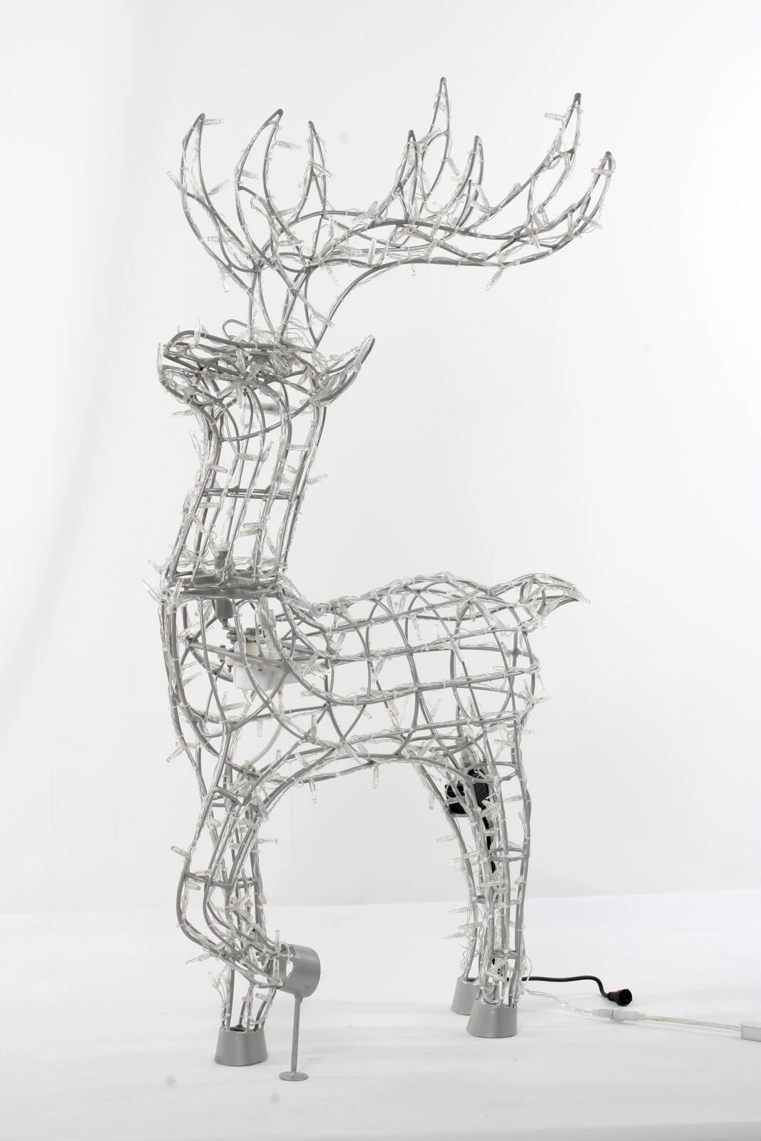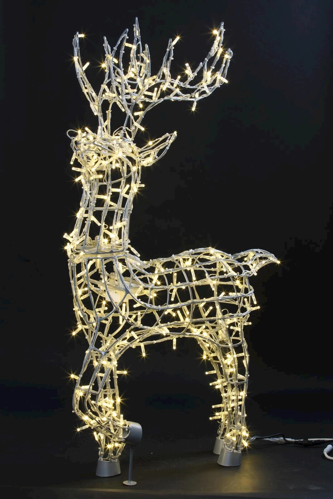 Das Rentier Willy mit 300 warmweissen LEDs sorgt im Innen- und Aussenbereich für eine festliche und einladende Atmosphäre. Mit einer Grösse von 120 × 80 × 25 cm ist es ein beeindruckender Blickfang, der sowohl in Gärten als auch auf Terrassen oder in Wohnräumen für weihnachtliche Stimmung sorgt. Der drehbare Kopf verleiht der Figur eine lebendige Ausstrahlung. Dank der Schutzklasse IP55 ist das Rentier staub- und strahlwassergeschützt und somit optimal für den Einsatz im Freien geeignet. Die Leistung beträgt 15 W, und im Lieferumfang sind ein passender Transformer sowie ein 5 m langes Netzkabel enthalten, wodurch Ihnen eine flexible Platzierung ermöglicht wird.
