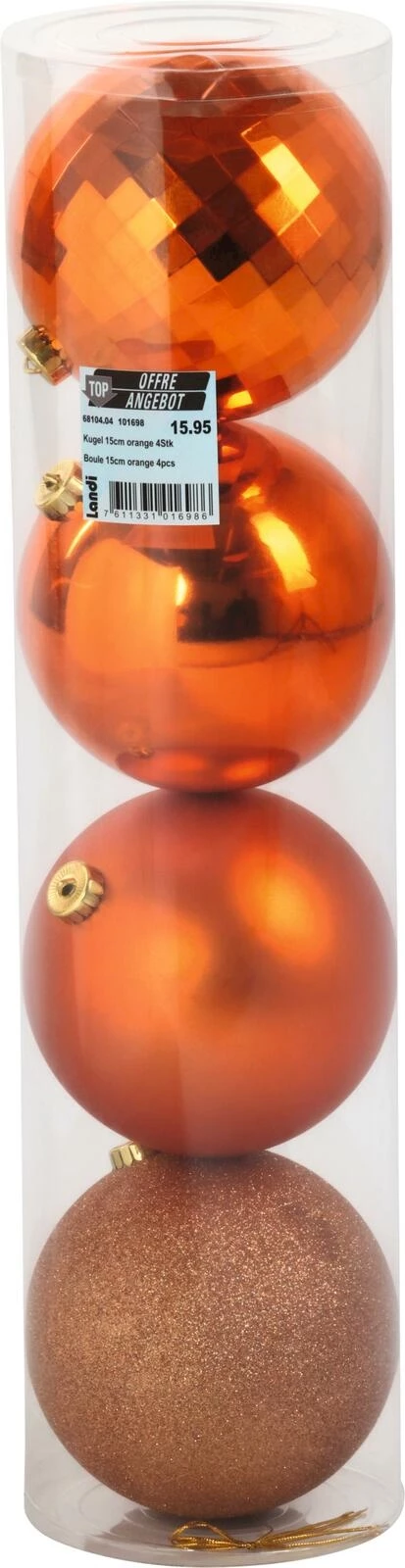 Grosse, dekorative Kugeln aus Kunststoff lassen sich ganz einfach durch die Aufhängung an einem Weihnachtsbaum befestigen. Die Christbaumkugeln sind durch den zur Herstellung verwendeten Kunststoff bruchfest. Im Lieferumfang sind 4 Kugeln mit unterschiedlichen Oberflächen enthalten. Ø 15 cm.