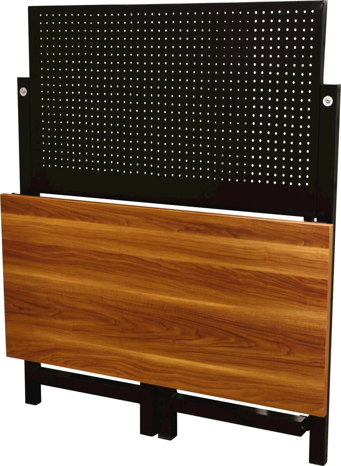 Ist klappbar, platzsparend, Hartfaserplatte trägt bis zu 200 kg, Lochplatte bis ca. 35 kg. Arbeitsplatte auf 80 cm Höhe, mit Kunststoffspritzguss geschützt. Unmontiert.