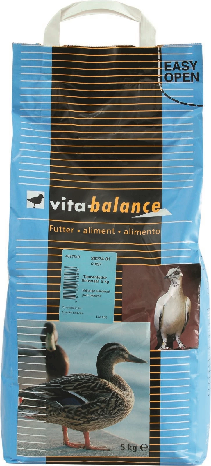 Dieses Universalfutter von Vita-Balance enthält viele hochwertige Körner und Pellets mit einem hohen Anteil an wichtigen Eiweissen, Vitaminen und Mineralstoffen. Zudem enthält das Futter auch Aminosäuren und Biotin, welches sich positiv auf das Federkleid auswirkt. Im Winter können sie das Universalfutter mit Braugerste ergänzen, um die Energiezufuhr zu steigern. Tauben ergänzen ihren Speisezettel gerne mit Insekten und anderen kleinen wirbellosen Tieren. Wir empfehlen zudem den Tauben einen freien Zugang zu Grit anzubieten. Packung immer gut verschliessen und das Futter kühl und trocken lagern. Geeignet für Tauben.
