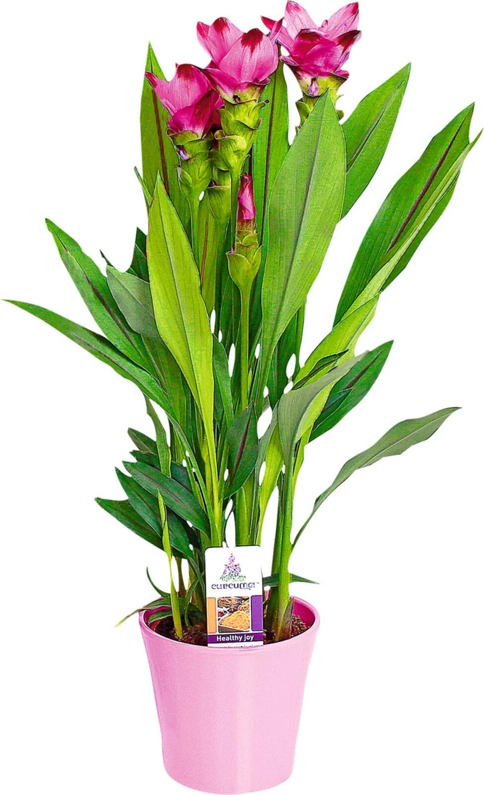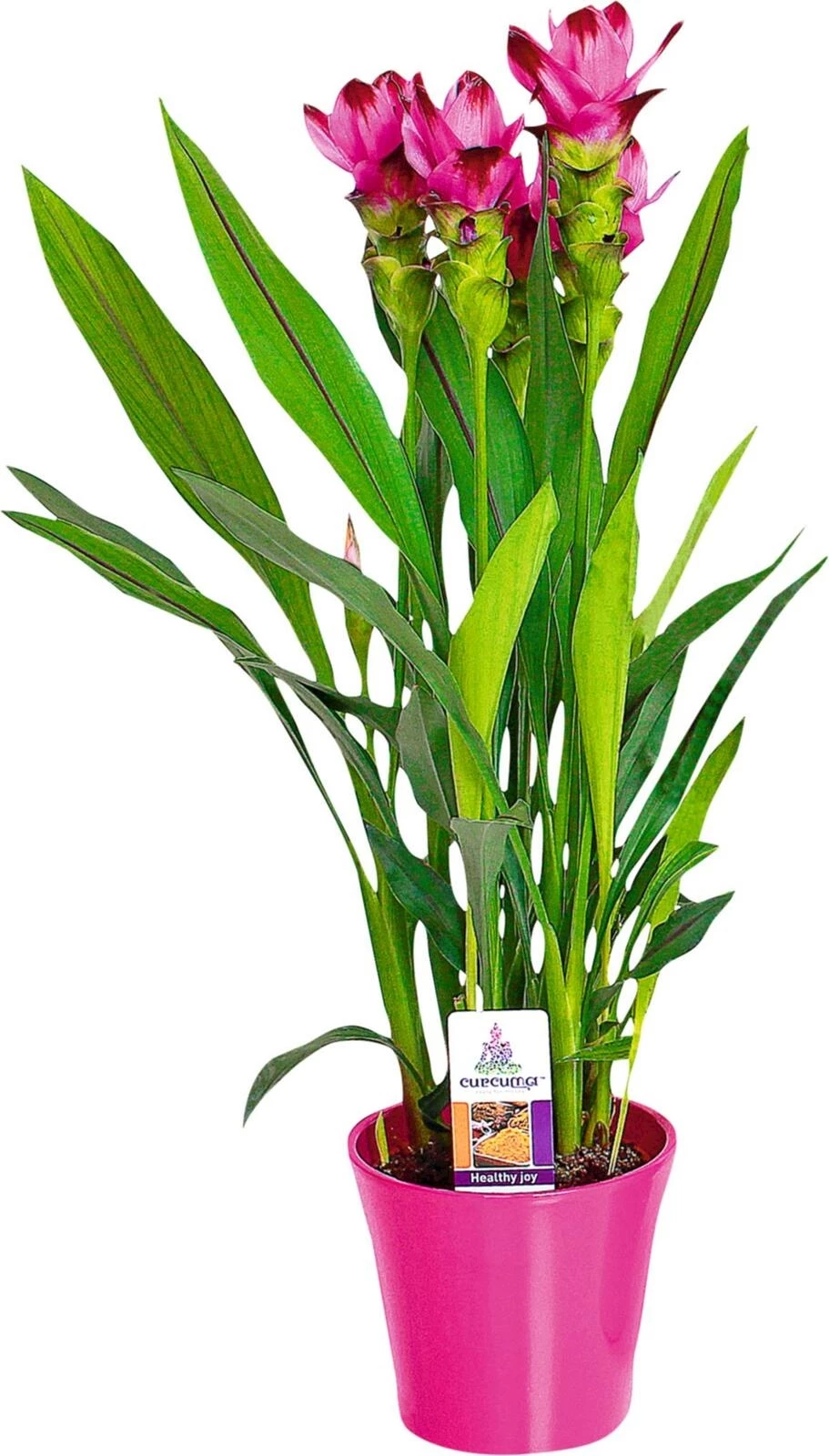 Curcuma ist eine tropische Pflanze mit pink-weissen Blüten, die Gärten, Terrassen oder Balkonen ein tropisches Flair verleiht. Wuchshöhe: 50–70 cm.